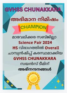 മാവേലിക്കര സബ്ജില്ലാ ശാസ്ത്രമേളയിൽ 'സയൻസ് മാഗസിൻ' വിഭാഗത്തിൽ A ഗ്രേഡോഡ് കൂടി ഒന്നാം സ്ഥാനം കരസ്ഥമാക്കിയ മാഗസിൻ (Mercurie Drops)തയ്യാറാക്കി ചുനക്കര GVHSS ലെ ശാസ്ത്രപ്രതിഭകൾ