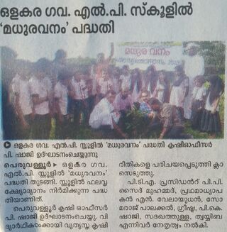 ഹരിത ക്ലബ്ബിന് കീഴിൽ ഒളകര ഗവ എൽപി സ്കൂളിൽ മധുരവനം പദ്ധതിക്ക് തുടക്കമായി. വിദ്യാലയാങ്കണത്തിൽ വൃക്ഷത്തൈ നട്ട് പെരുവള്ളൂർ കൃഷി ഓഫീസർ പി ഷാജി ഉദ്ഘാടനം നിർവഹിച്ചു. വിദ്യാർത്ഥികൾക്കായി വ്യത്യസ്ത കൃഷിരീതികളെ പരിചയപ്പെടുത്തി ക്ലാസെടുത്തു. മാവ്, സപ്പോട്ട പേര, ബദാം തുടങ്ങിയ വിവിധ ഫലവൃക്ഷ തൈകൾ വിദ്യാർത്ഥികളും അധ്യാപകരും കൊണ്ടുവന്ന് പിടിപ്പിച്ചായിരുന്നു മധുരവനം പദ്ധതിയുടെ തുടക്കം കുറിക്കുന്നത്. പിടിഎ പ്രസിഡന്റ് പി .പി.സൈദ് മുഹമ്മദ്, പ്രധാനാദ്ധ്യാപകൻ എൻ.വേലായുധൻ, സോമരാജ് പാലക്കൽ നേതൃത്വം നൽകി.