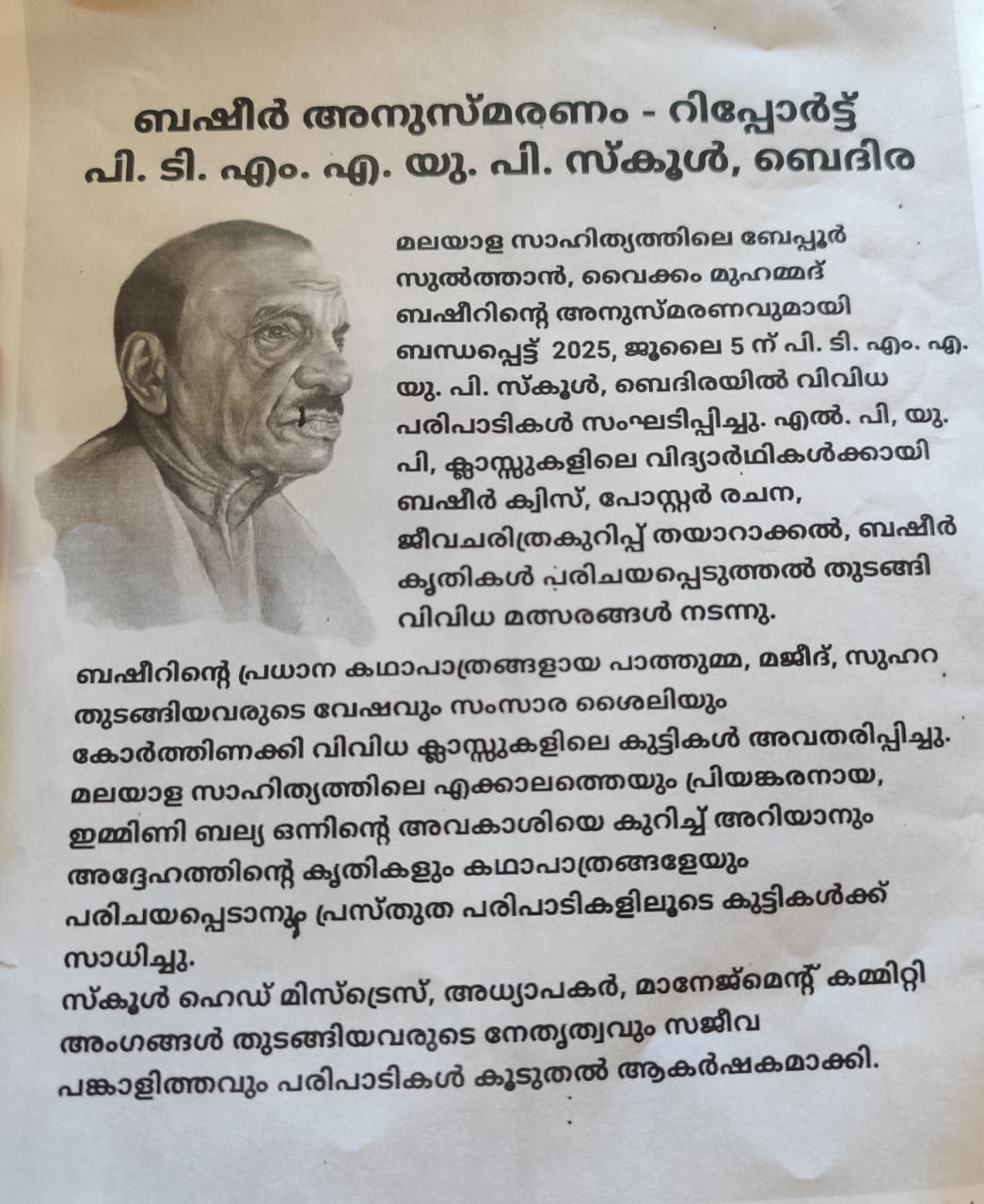ബഷീർ അനുസ്മരണം റിപ്പോർട്ട് പി ടി എം യു പി സ്കൂൾ ബെദിര