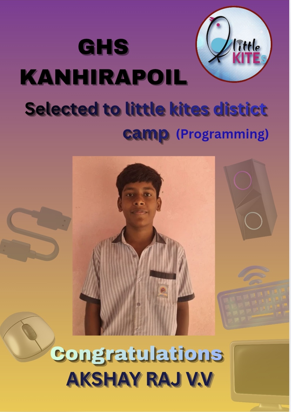 ജില്ലാതല ക്യാമ്പിലേക്ക് തെരഞ്ഞെടുക്കപ്പെട്ട അക്ഷയ് രാജ് വി വി. പ്രോഗ്രാമിംഗ് വിഭാഗത്തിലാണ് സെലക്ട് ആയത്