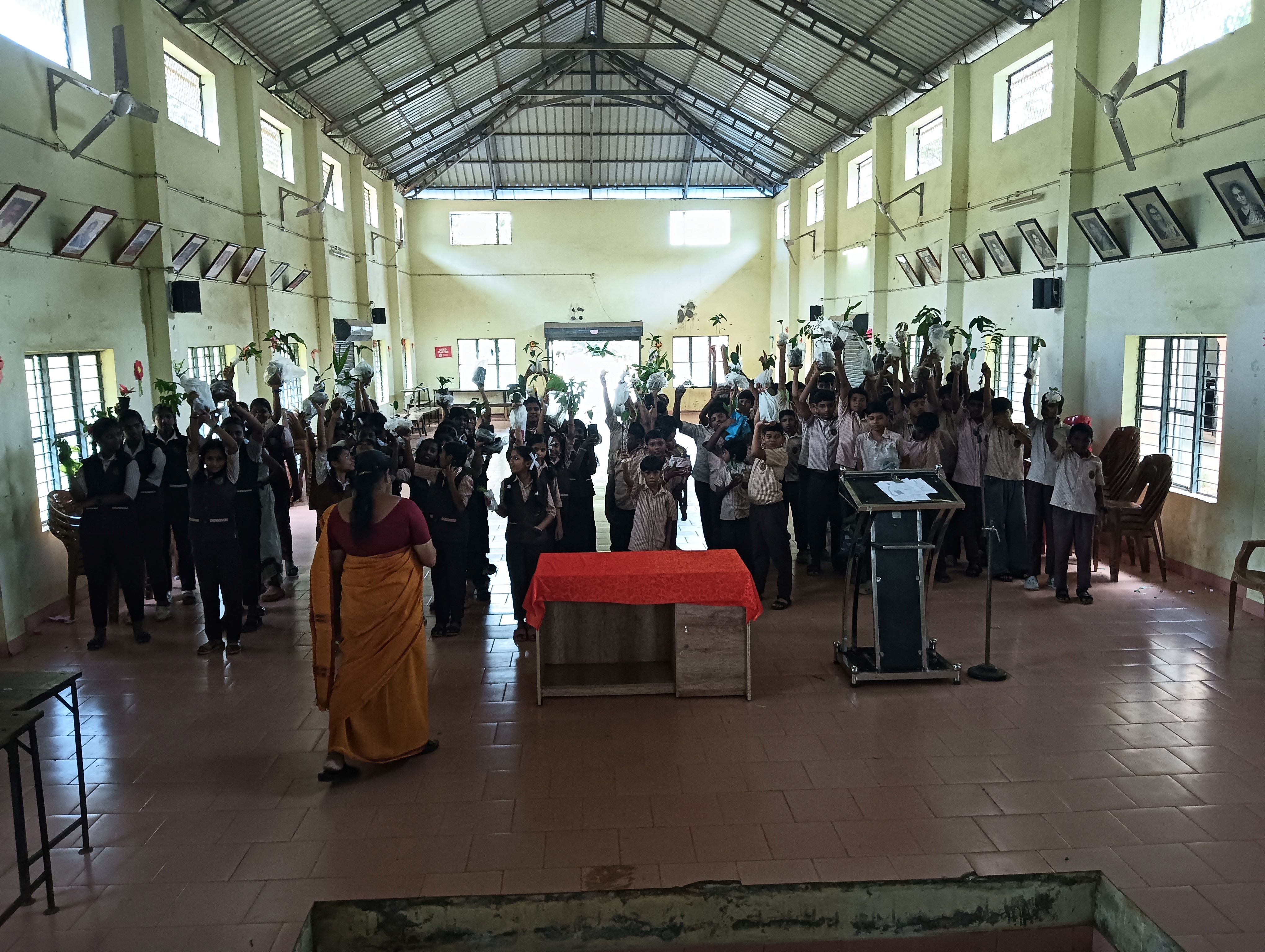 വിദ്യാർത്ഥികൾ തങ്ങളുടെ ചങ്ങാതിമാർക്ക് ചെടി തൈകൾ കൈമാറുന്നു