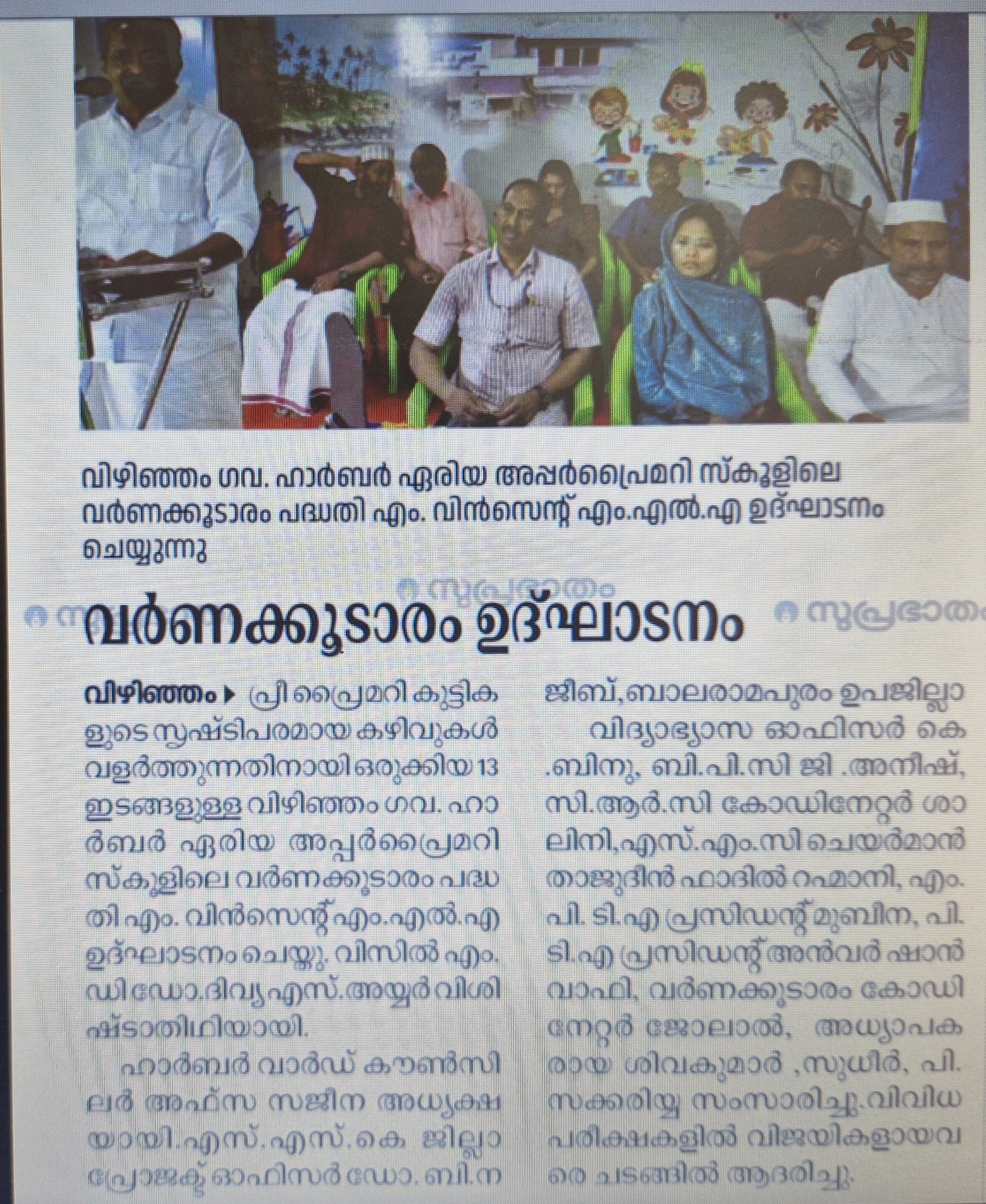വിഴിഞ്ഞം ഗവഃ ഹാർബർ ഏര്യ അപ്പർ പ്രൈമറി സ്കൂളിൽ നടന്ന വർണ്ണക്കൂടാരം ഉദ്ഘാടനത്തിന്റെ പത്ര റിപ്പോർട്ട്