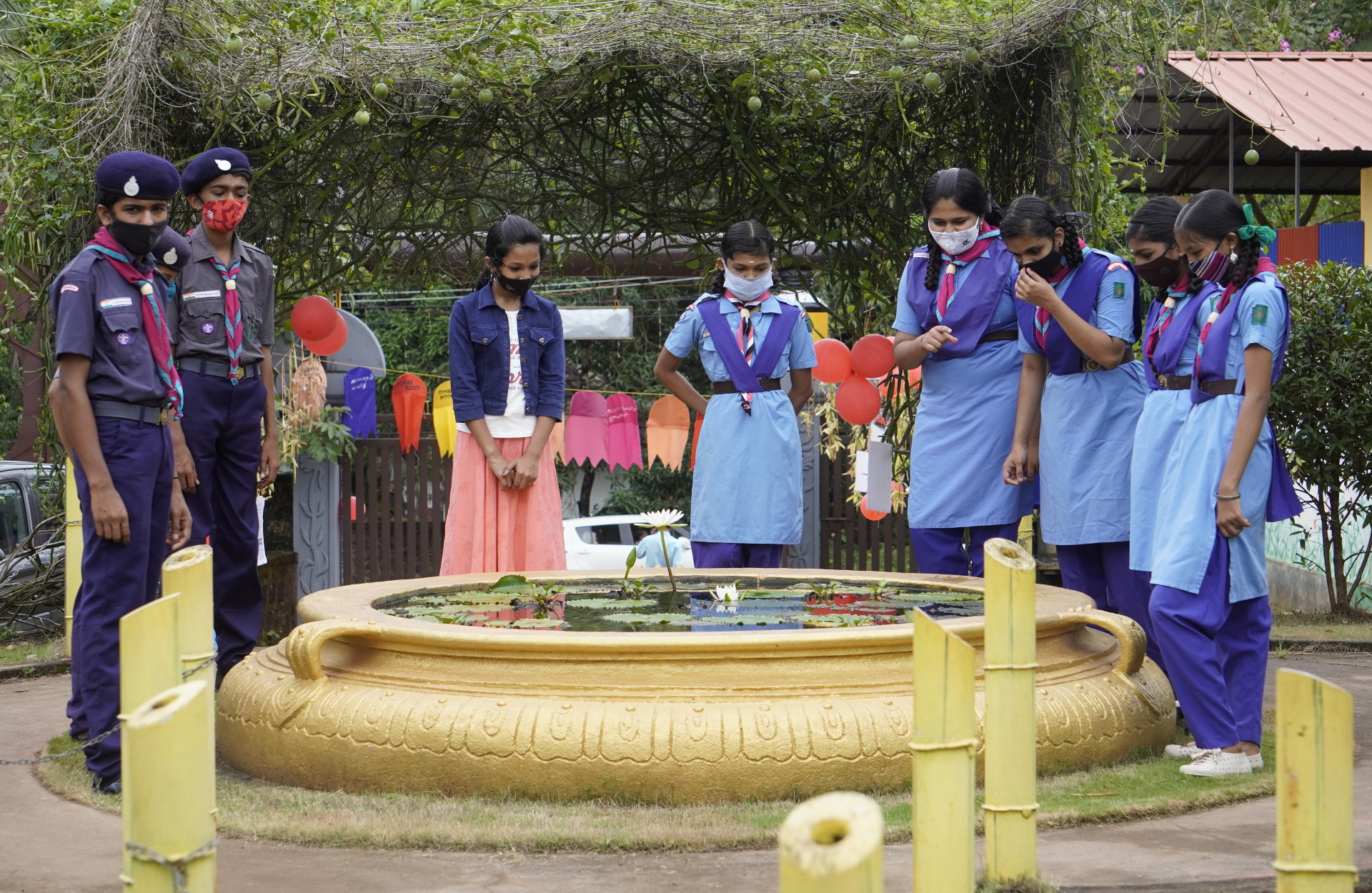 മലയാളം⧼Colon⧽ ഗവ.ഹൈസ്കൂൾ തച്ചങ്ങാട് ജൈവവൈവിധ്യപാർക്കിലെ കുളത്തിലെ മത്സ്യങ്ങളെയും തവളകളെയും കൗതുകത്തോടെ നിരീക്ഷിക്കുന്ന കുട്ടികൾ