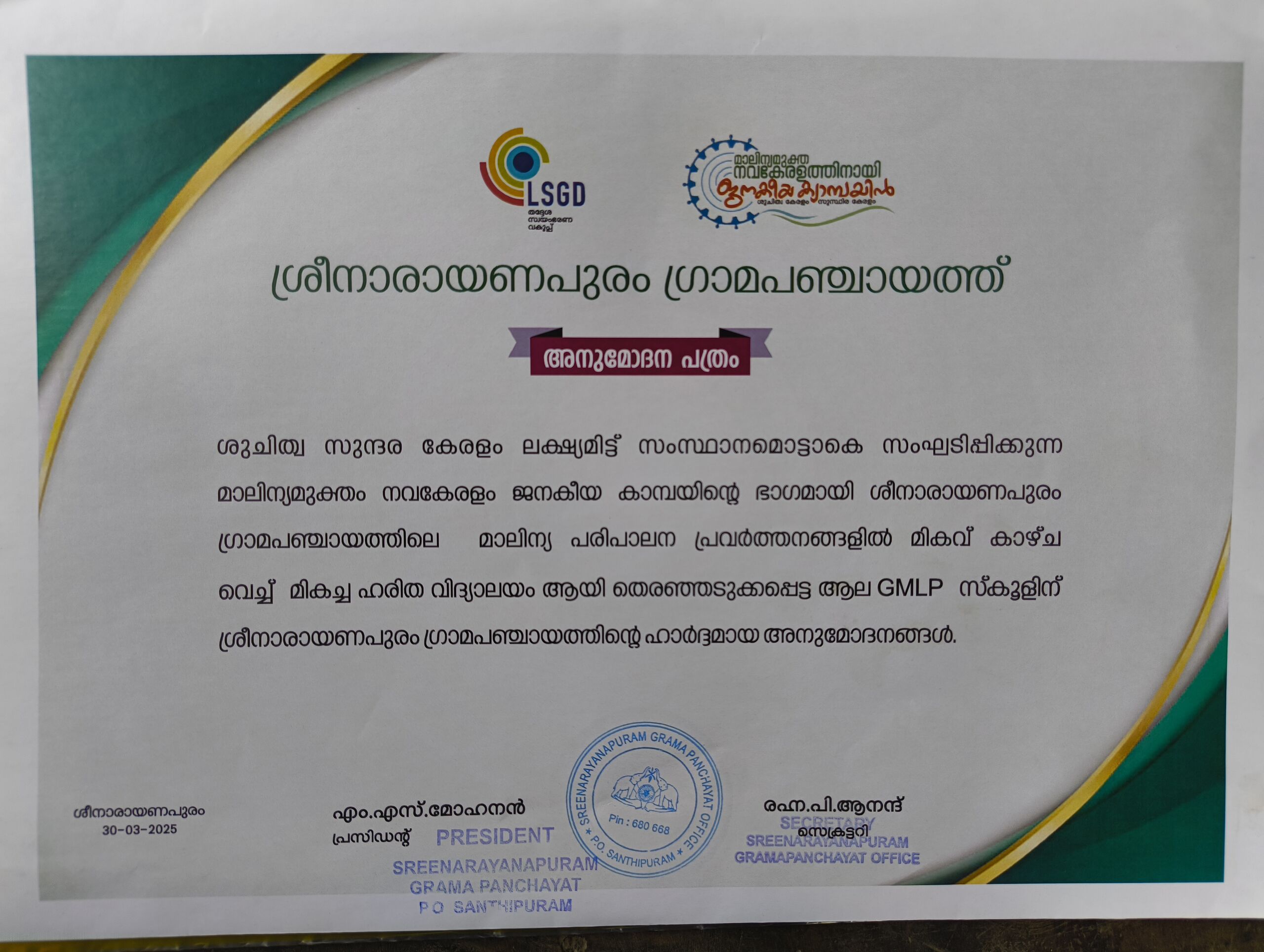 ശ്രീനാരായണ പുരം പഞ്ചായത്തിലെ മികച്ച ഹരിത വിദ്യാലയമായി തിരഞ്ഞെടുക്കപ്പെട്ടു.