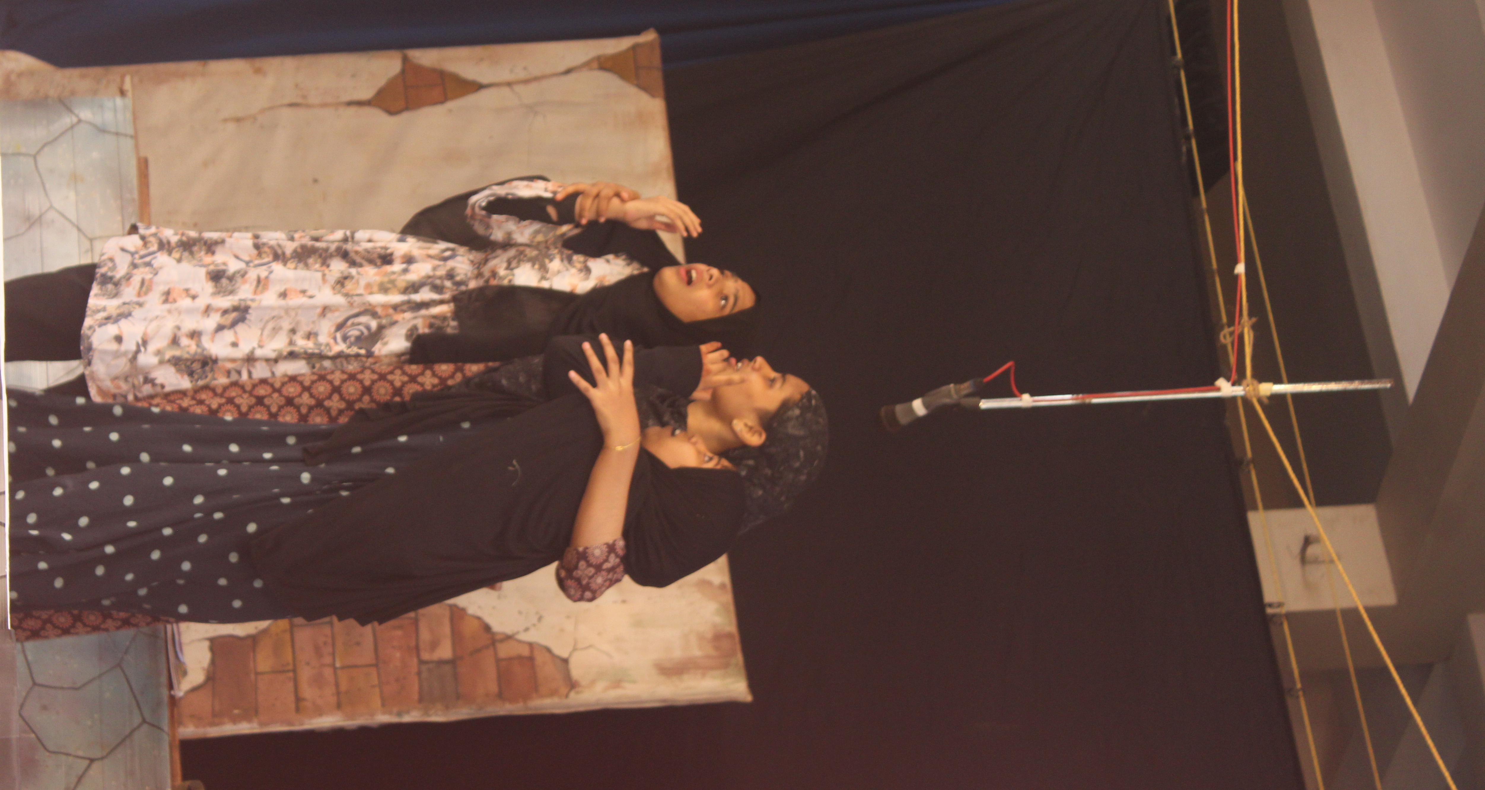 Three High School girls perform an Arabic Drama (Play) at Stage 16 (Vaadamalli) during the 64th Kerala School Kalolsavam 2026. The performers are captured in an emotive moment, looking upward toward a hanging microphone. They are dressed in hijabs and patterned gowns, performing against a theatrical backdrop depicting a brick wall at CMS HSS Thrissur.