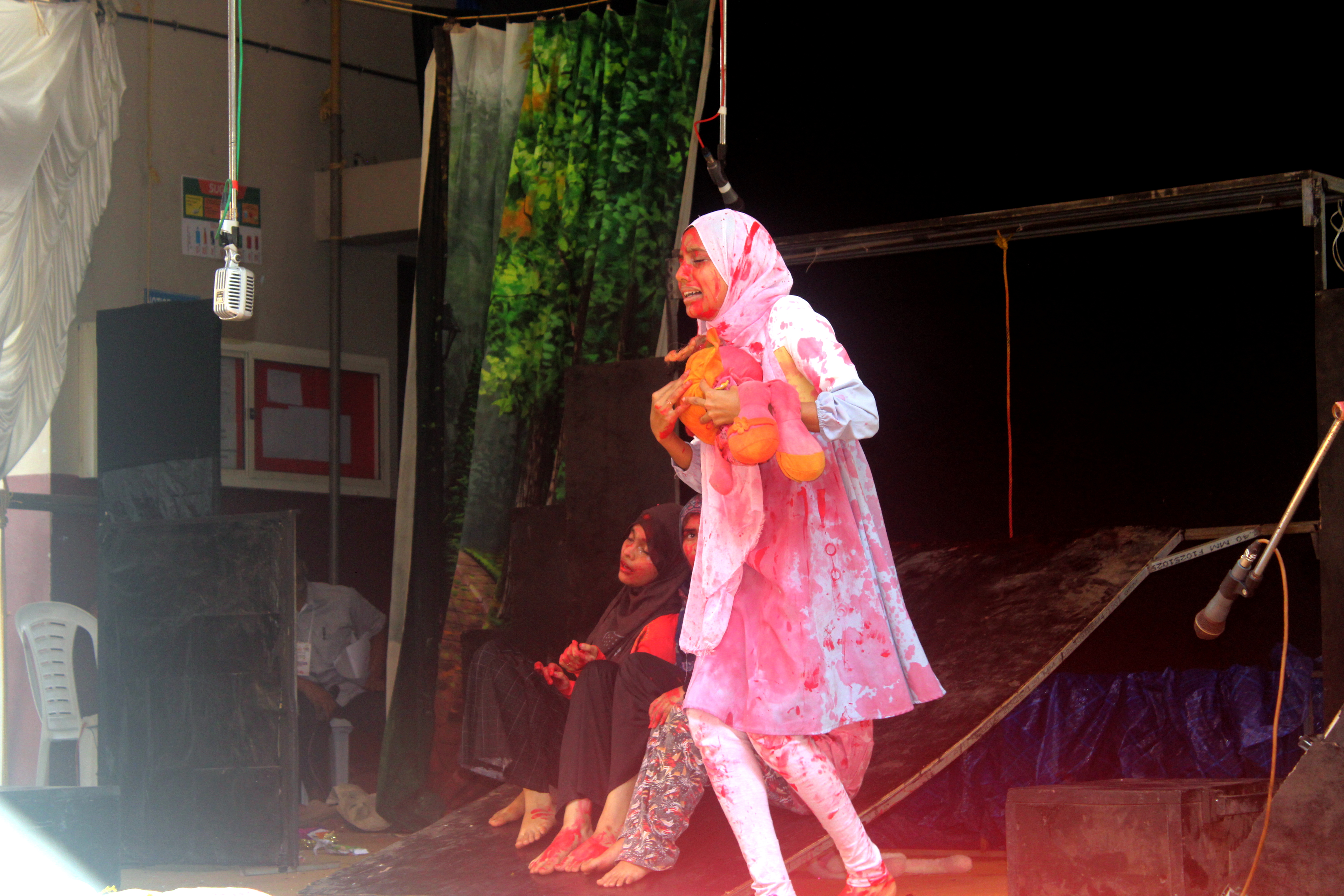 An emotive scene from an Arabic Drama (Play) performance at Stage 16 (Vaadamalli) during the 64th Kerala School Kalolsavam 2026. The photograph, captured by Manas C Krishnna, shows a High School girl in a white dress and pink hijab covered in red paint (simulating blood) while holding a doll. Two other performers sit behind her on a sloped stage prop at CMS HSS Thrissur. This intense skit is part of the theatrical competitions held during the state-level festival in January 2026.