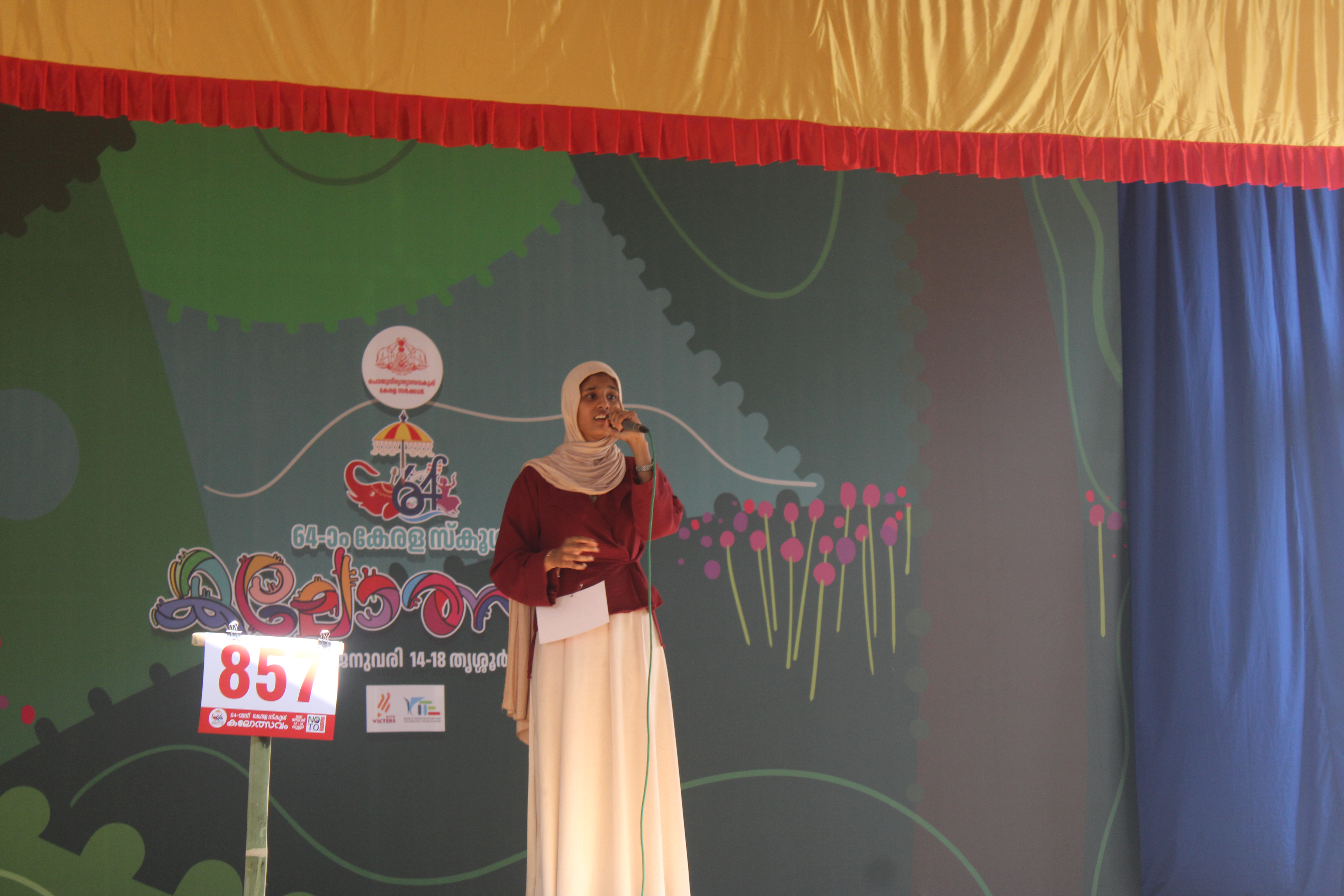 A High School girl (Chest No. 862) participates in the Arabic Gaanam (Arabic Song) competition at Stage 16 (Vaadamalli) during the 64th Kerala School Kalolsavam 2026. Dressed in a white embroidered top and a maroon hijab, the contestant is captured mid-performance using a microphone. The stage features a green-toned backdrop with floral illustrations and the official festival logo. Located at CMS HSS Thrissur, this venue highlights the diverse linguistic traditions celebrated at the festival.