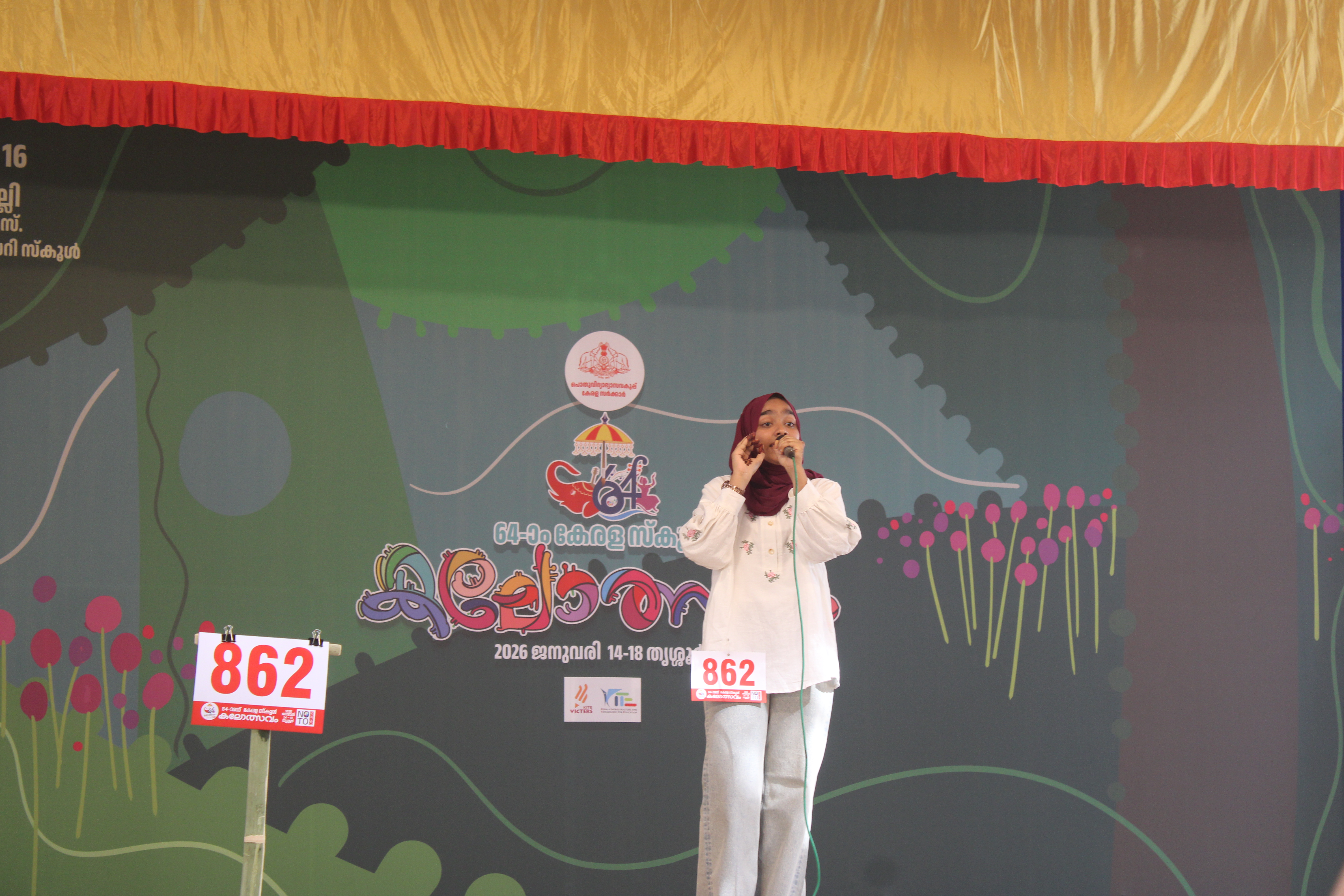 | നിലവിലുള്ളത് | 19:21, 16 ജനുവരി 2026 | 6,000 × 4,000 (8.16 എം.ബി.) | 9446078880 (സംവാദം | സംഭാവനകൾ) | A High School girl performs Arabic Gaanam (Arabic Song) at Stage 16 (Vaadamalli) during the 64th Kerala School Kalolsavam 2026. Dressed in a white top and maroon hijab, the contestant (Chest No. 862) is captured mid-performance against a green and floral-themed festival backdrop. This stage, located at CMS HSS Thrissur, hosted various linguistic and vocal competitions. Photo clicked by: Aadhel Noble Venue: Stage 16 Vaadamalli, Thrissur |