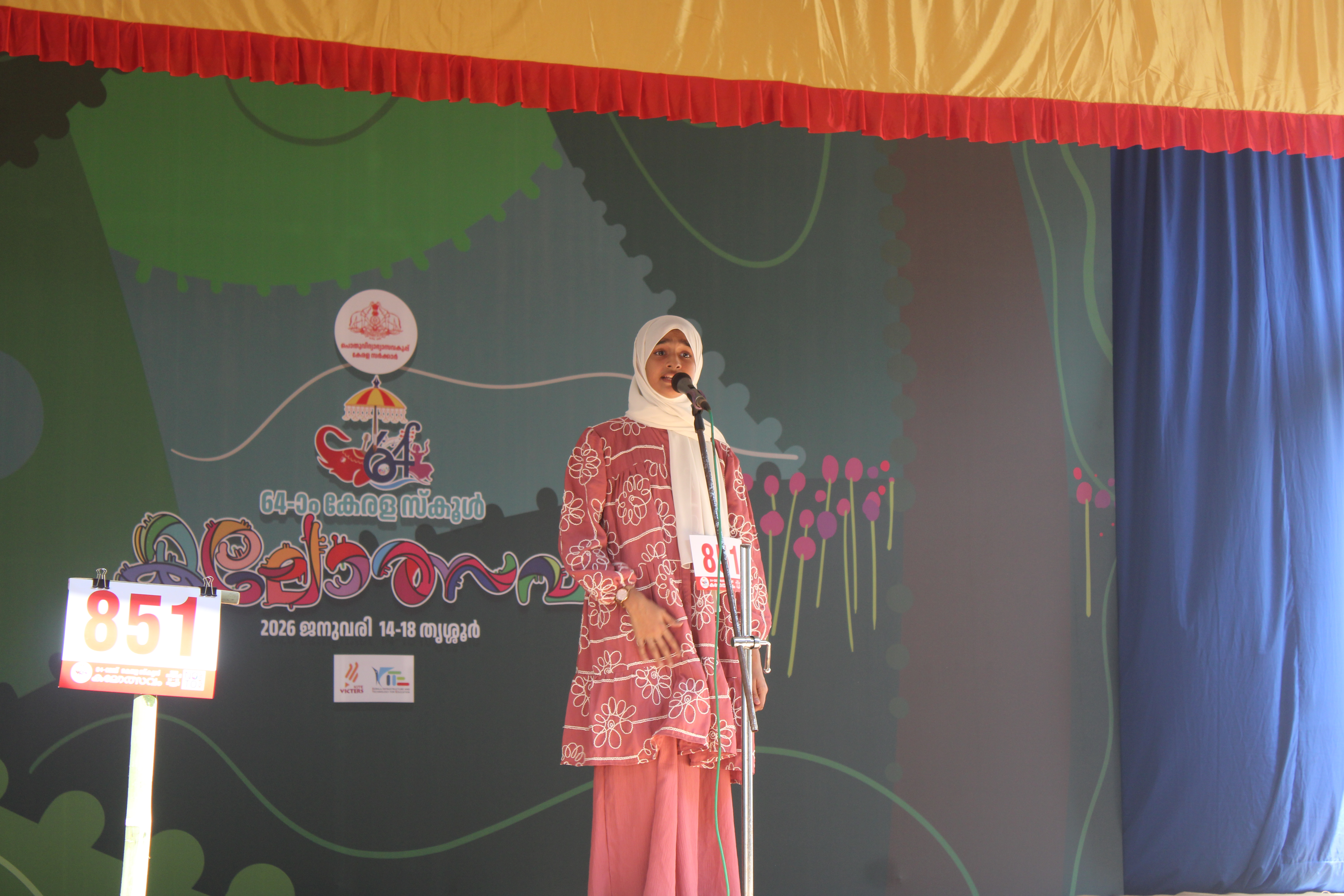 A High School girl (Chest No. 851) performs Arabic Gaanam (Arabic Song) during the 64th Kerala School Kalolsavam 2026 at Stage 16 (Vaadamalli). Dressed in a patterned pink tunic and white hijab, the student is captured singing into the microphone. The stage backdrop features floral patterns, the official festival logo, and the venue's name, Vaadamalli, which is located at CMS HSS Thrissur.