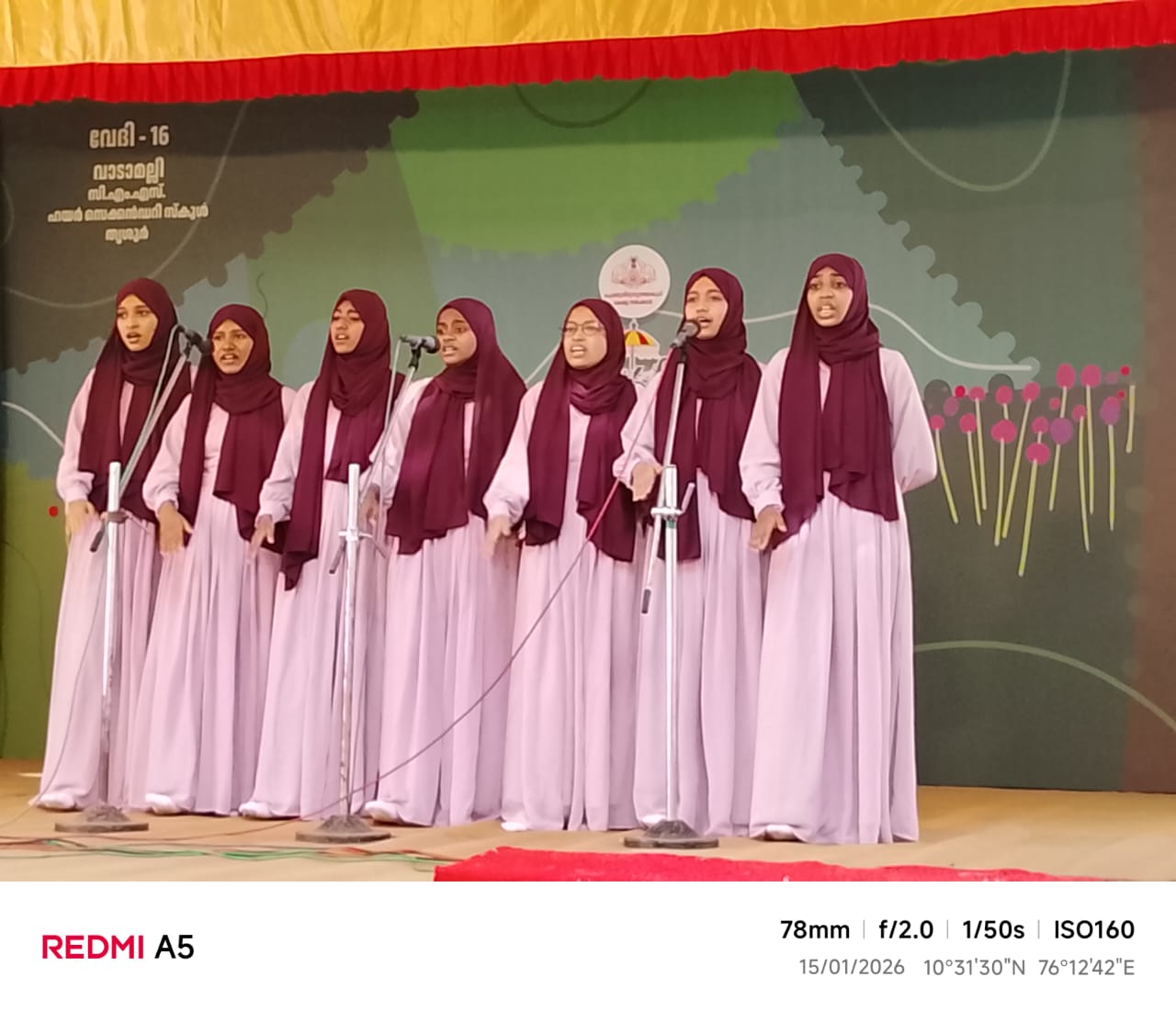 | നിലവിലുള്ളത് | 21:13, 16 ജനുവരി 2026 | 1,280 × 1,101 (114 കെ.ബി.) | 9446078880 (സംവാദം | സംഭാവനകൾ) | A High School girls' team performs the Arabic Group Song competition at Stage 16 (Vaadamalli) during the 64th Kerala School Kalolsavam 2026. The seven performers are dressed in uniform light-purple gowns with dark-maroon hijabs. They are captured mid-performance, singing into microphones against the green and yellow festival backdrop at CMS HSS Thrissur. The photograph was taken by Kashinadhan CR on January 15, 2026, using a Redmi A5. Photo clicked by: Kashinadhan CR Venue: Stage 16 Vaad... |