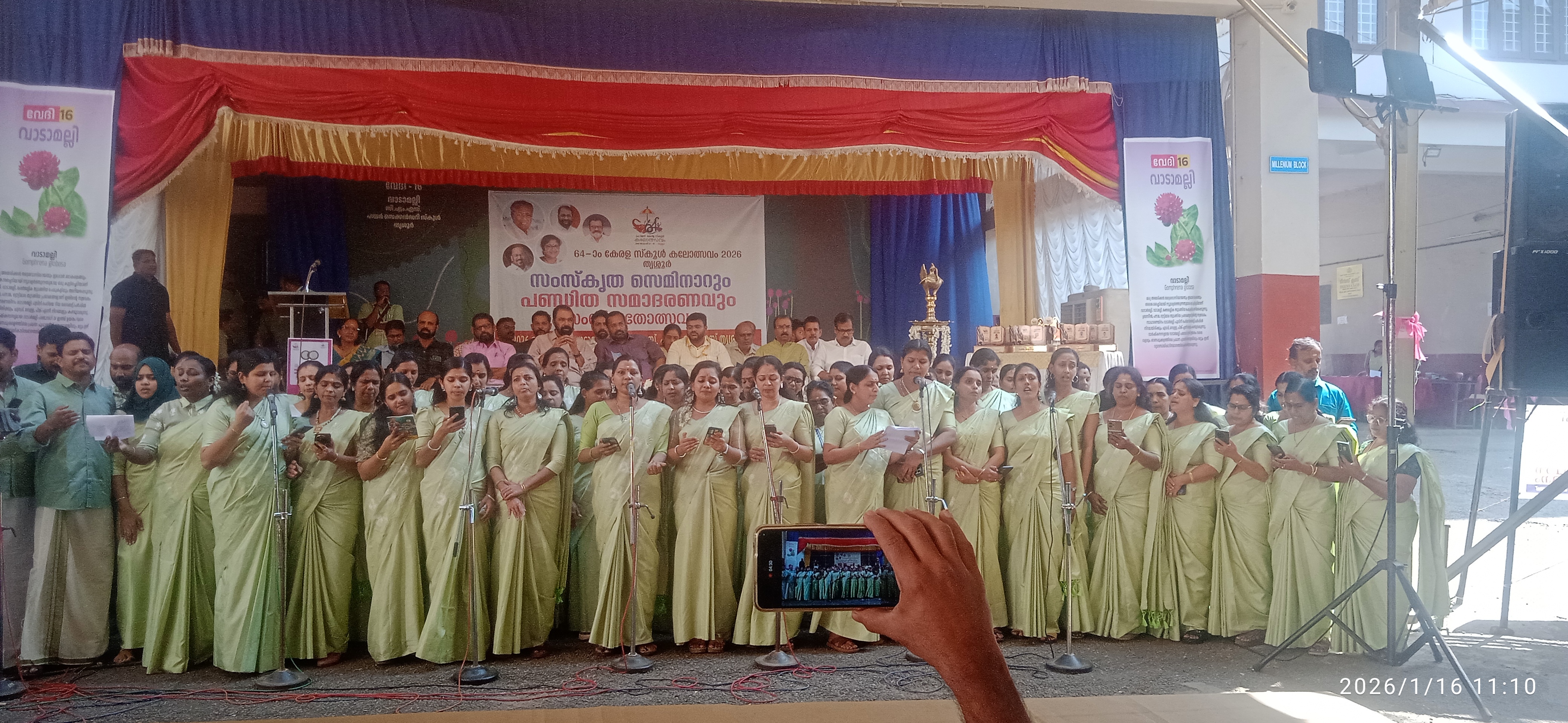 | നിലവിലുള്ളത് | 20:16, 16 ജനുവരി 2026 | 4,160 × 1,920 (3.49 എം.ബി.) | 9446078880 (സംവാദം | സംഭാവനകൾ) | A large group of women in matching light-green sarees performs a choral song during the Arabic Seminar event at Stage 16 (Vaadamalli). Held at CMS HSS Thrissur during the 64th Kerala School Kalolsavam 2026, the stage features a prominent banner for the seminar and the official festival branding. The image, captured by Elvin Jineesh Shango, shows the participants using microphones and smartphones to read lyrics, highlighting the community and academic aspects of the festival. Photo clicked by... |
