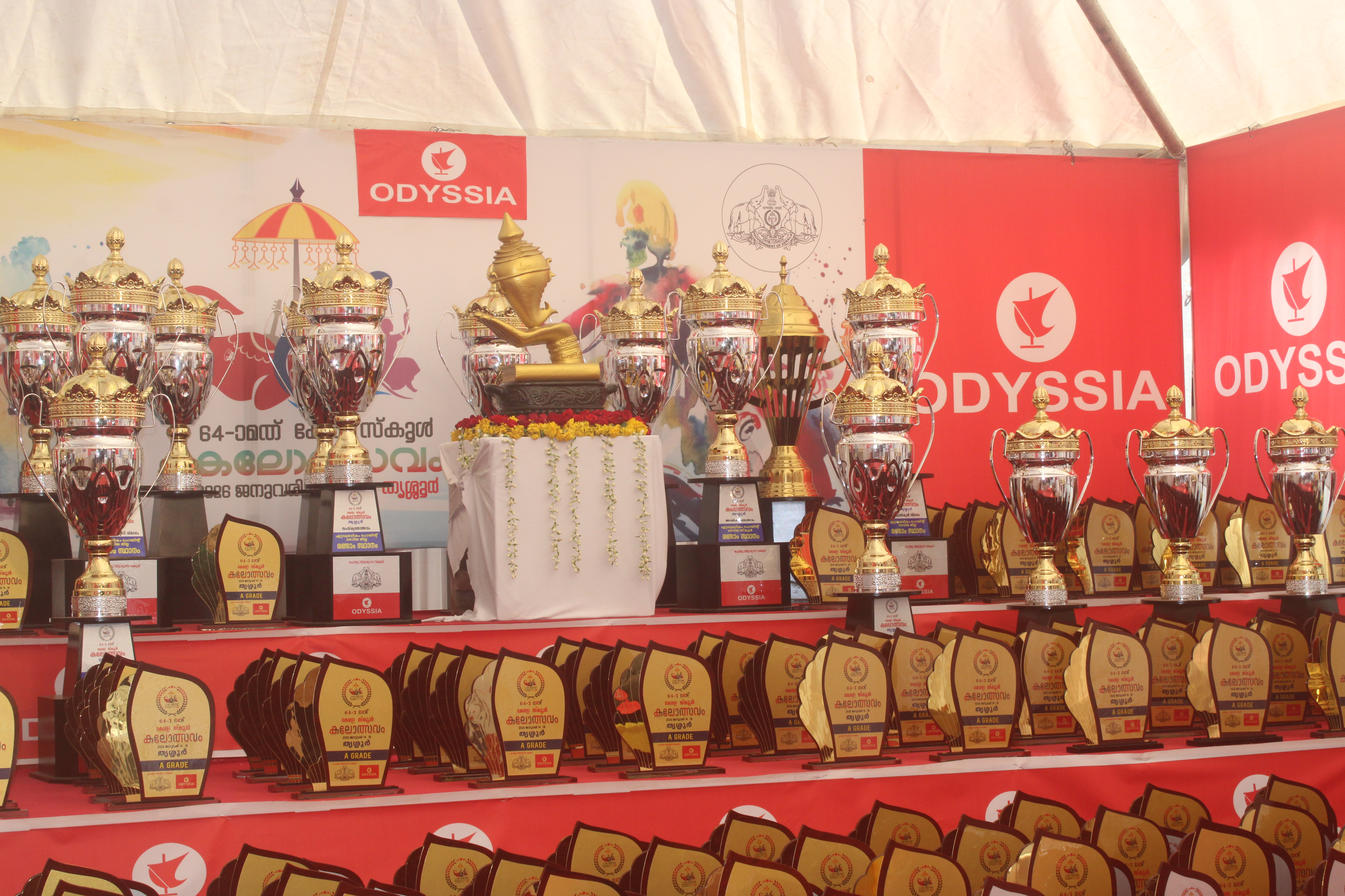 A grand display of trophies and plaques arranged at the Govt. Model Girls Higher Secondary School, Thrissur, during the 64th Kerala School Kalolsavam 2026. The collection features tiered rows of gold-and-silver championship trophies and "A Grade" merit plaques, set against a backdrop featuring the official festival branding and sponsor logos. This display represents the high level of achievement and recognition awarded to the talented participants of the state's largest cultural youth festival.