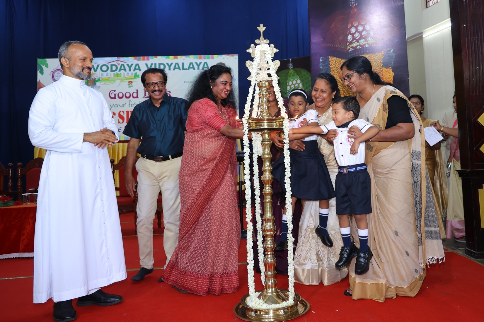 വിദ്യാർത്ഥികളും അധ്യാപകരും ചേർന്ന് നിലവിളക്കിൽ തിരി തെളിയിക്കുന്നു.