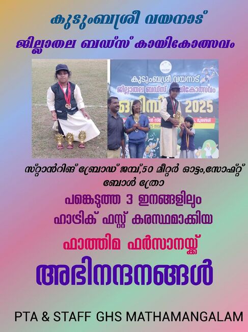 ജി എച്ച് എസ് എസ് പനമരത്തുവെച്ച് നടന്ന ഉപജില്ലാമത്സരത്തിന്റെ അടിസ്ഥാനത്തിൽ മാതമംഗലത്തെ മുഹമ്മദ് റാസി ജില്ലയെ പ്രതിനിധീകരിച്ച് 10/10/2025 ന് പാലക്കാടുവെച്ച് നടക്കുന്ന സംസ്ഥാന ഫുട്ബോൾ മത്സരത്തിൽ പങ്കെടുക്കാൻ യോഗ്യത നേടി.