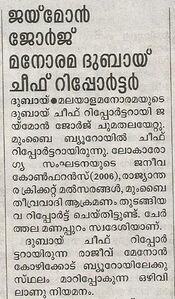 <p style="text-align: justify">ഇന്ത്യയിലെ ഏറ്റവും വലിയ ഭാഷാ ദിനപത്രമായ മലയാള മനോരമയുടെ ഹൈക്കോടതി ലേഖകൻ, മനോരമ കൊച്ചി യൂണിറ്റിൽ ചീഫ് റിപ്പോർട്ടർ.<h3></h3> | <p style="text-align: justify">ഇന്ത്യയിലെ ഏറ്റവും വലിയ ഭാഷാ ദിനപത്രമായ മലയാള മനോരമയുടെ ഹൈക്കോടതി ലേഖകൻ, മനോരമ കൊച്ചി യൂണിറ്റിൽ ചീഫ് റിപ്പോർട്ടർ.<h3></h3> | ||
