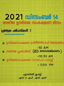 ഡിസംബർ 14 ദേശീയ ഊർജ്ജസംരക്ഷണ ദിനം. ഊർജ്ജം സംരക്ഷിക്കേണ്ടതിന്റെ ആവശ്യകത ഓർമപ്പെടുത്തി ഓരോ വർഷവും ഈ ദിവസം കടന്നുപോകുന്നു. | <big>ഡിസംബർ 14 ദേശീയ ഊർജ്ജസംരക്ഷണ ദിനം. ഊർജ്ജം സംരക്ഷിക്കേണ്ടതിന്റെ ആവശ്യകത ഓർമപ്പെടുത്തി ഓരോ വർഷവും ഈ ദിവസം കടന്നുപോകുന്നു.</big> | ||