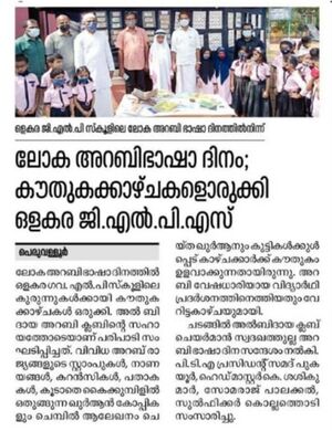 ലോക അറബി ഭാഷാ ദിനാചരണത്തിന്റെ ഭാഗമായി പുകയൂർ ഒളകര ഗവ.എൽ.പി സ്കൂൾ വിദ്യാർഥികൾ അറബി ഭാഷാ ദിനം ആചരിച്ചു. അറബി ഭാഷയുടെ പ്രാധാന്യം വെളിപ്പെടുത്തി വിദ്യാർഥികൾ നിശ്ചലദൃശ്യം അവതരിപ്പിച്ചും മഹിമ വിളിച്ചോതി പ്ലക്കാർഡുകൾ കയ്യിലേന്തി കുരുന്നുകൾ അണിനിരക്കുകയും ചെയ്തു . ഭാഷാ ക്വിസ്, ഡോ ക്യുമെന്ററി പ്രദർശനം എന്നിവയും നടന്നു. അറബി ക്ലബ്ബ് അൽബിദായയും ഭാഷാധ്യാപകരായ ജംഷിദ്, സദഖത്തുല്ല നേതൃത്വം എന്നിവരും നൽകി. | |||