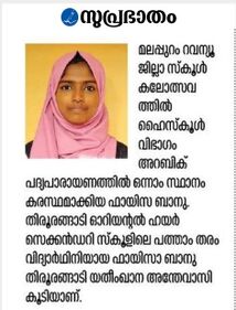 ഫായിസാബാനു .സി എന്ന വിദ്യാർഥിനി അറബിക് പദ്യംചൊല്ലലിൽ സംസ്ഥാന കലോത്സവത്തിൽ എ ഗ്രേഡോടെ ഒന്നാം സ്ഥാനം നേടി സ്ഥാപനത്തിന്റെ അഭിമാനമായി മാറി. | |||