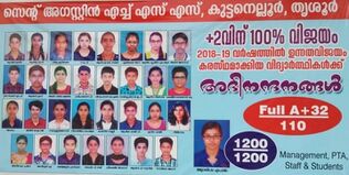 ശ്രീമതി ഷമ്മി പോൾ ആണ് ഹയർ സെക്കന്ററി വിഭാഗത്തിന്റെ പ്രിൻസിപ്പൽ .പഠനത്തോടൊപ്പം തന്നെ കലാകായിക രംഗത്തും വിദ്യാർത്ഥികൾ മികച്ച പ്രകടനം കാഴ്ചവെച്ച് മുന്നേറുന്നു . വിവര സാങ്കേതിക വിദ്യയിൽ പരിശീലനം നേടിയ എല്ലാ അധ്യാപകരും ഐ.ടി അധിഷ്ഠിത ബോധന രീതിയിലൂടെ അധ്യയനം നടത്തുന്നു. 2017-2019 അധ്യനവര്ഷത്തിൽ ജ്യോതിഷ എം ജെ , 2018-2020 ൽ ഫഹമിയ സലിം, 2019 -2021 ൽ ഗൗരിനന്ദ ബി , നവ്യ ഇ എസ് എന്നിവരും 1200 ൽ 1200 മാർക്കും നേടി സെന്റ് അഗസ്റ്റിൻ ഹയർ സെക്കന്ററി വിദ്യാലയത്തിന്റെ യശസ്സ് വാനോളം ഉയർത്തി . കലോത്സവവേദികളിലും ഐ ടി മേളകളിലും എന്നും മുൻപന്തിയിലാണ് സെന്റ് അഗസ്റ്റിൻ കുടുംബം .