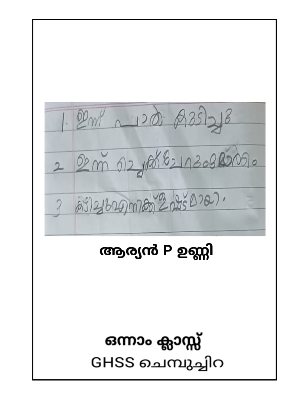 | 13:25, 26 മാർച്ച് 2024 | 23039-TSR-KUNJ-AARYAN P UNNI.jpg (പ്രമാണം) | 53 കെ.ബി. | kunjezhuth of class 1 students വർഗ്ഗം:ഒന്നാം ക്ലാസ്സുകാരുടെ രചനകൾ | 1 | |