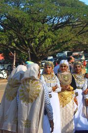 | 22:00, 15 ജനുവരി 2026 | KSK2026-22034-2- Oppana- Manas C Krishnna.JPG (പ്രമാണം) | 6.85 എം.ബി. | Four young women dressed in traditional Oppana attire pose for a group portrait at the 64th Kerala School Kalolsavam 2026. They are wearing white ceremonial dresses with green trim, intricate gold jewelry featuring green stones, and traditional white headscarves. Their synchronized costumes and formal stage makeup represent one of the festival's most popular Muslim cultural art forms. Photo clicked by: Manas C Krishnna Venue: Kerala School Kalolsavam 2026 Grounds | 1 | |