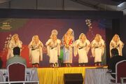 | 19:58, 16 ജനുവരി 2026 | KSK2026-22034-2- Oppana- Hrishikesh PS.JPG (പ്രമാണം) | 8.12 എം.ബി. | A High School girls' team performs Oppana at Stage 2 (Paarijaatham) during the 64th Kerala School Kalolsavam 2026. The photograph highlights the lead contestant, the bride (Chest No. 154), standing in a central position wearing a magnificent blue and gold traditional Mappila outfit. She is flanked by dancers in white and gold attire performing rhythmic seated movements. The performance takes place at CMS HSS Thrissur, with the vibrant purple and orange festival backdrop clearly visible. Phot... | 1 | |