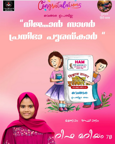 ഹിന്ദി വിഷയവുമായി ബന്ധപ്പെട്ട് നടത്തിയ വിജ്ഞാൻ സാഗർ പ്രതിഭാ പുരസ്കാർ മത്സരത്തിൽ ഉപജില്ലാ തലത്തിൽ ടി എസ് എം യു പി സ്കൂളിലെ റിഫ മറിയം മൂന്നാം സ്ഥാനം കരസ്ഥമാക്കി.
