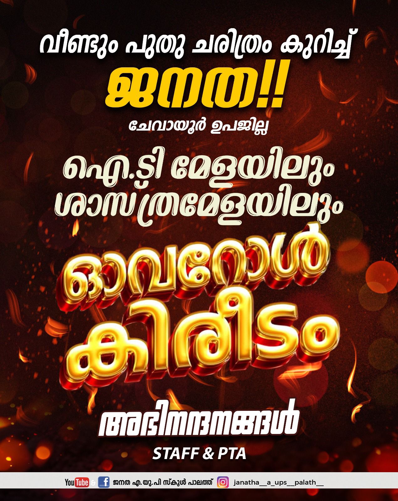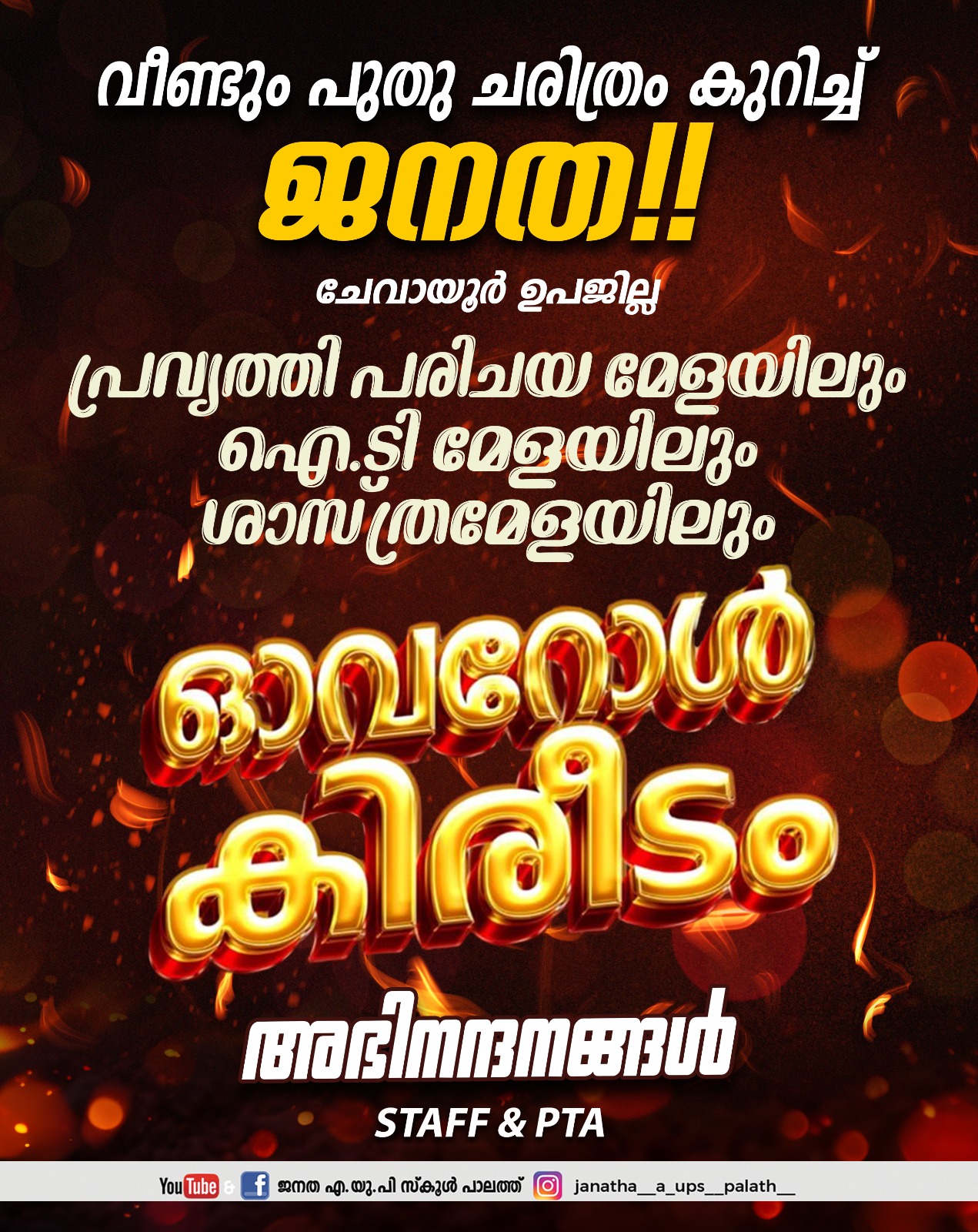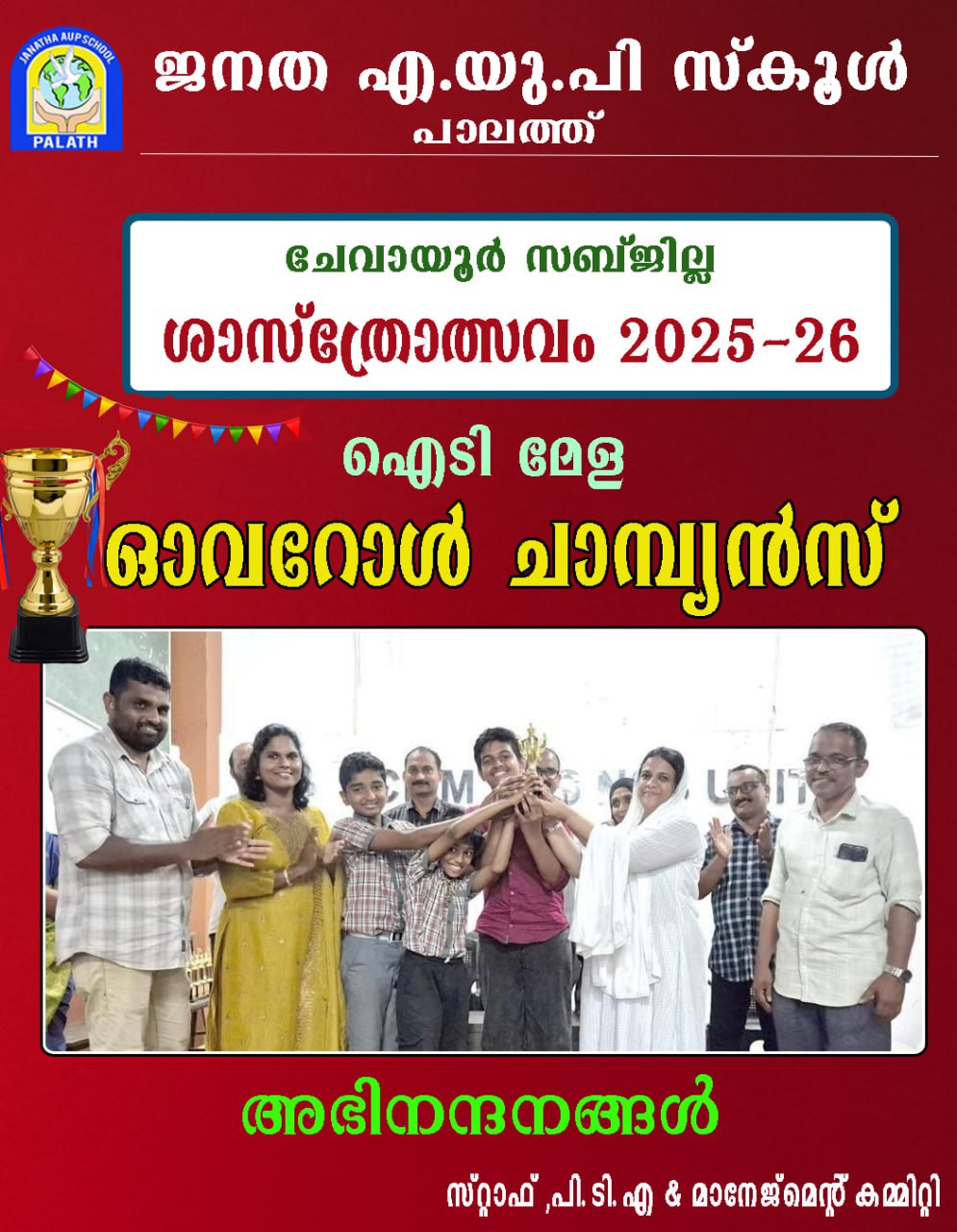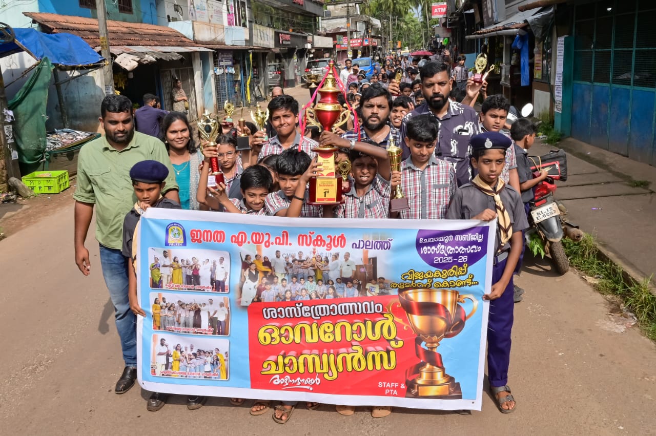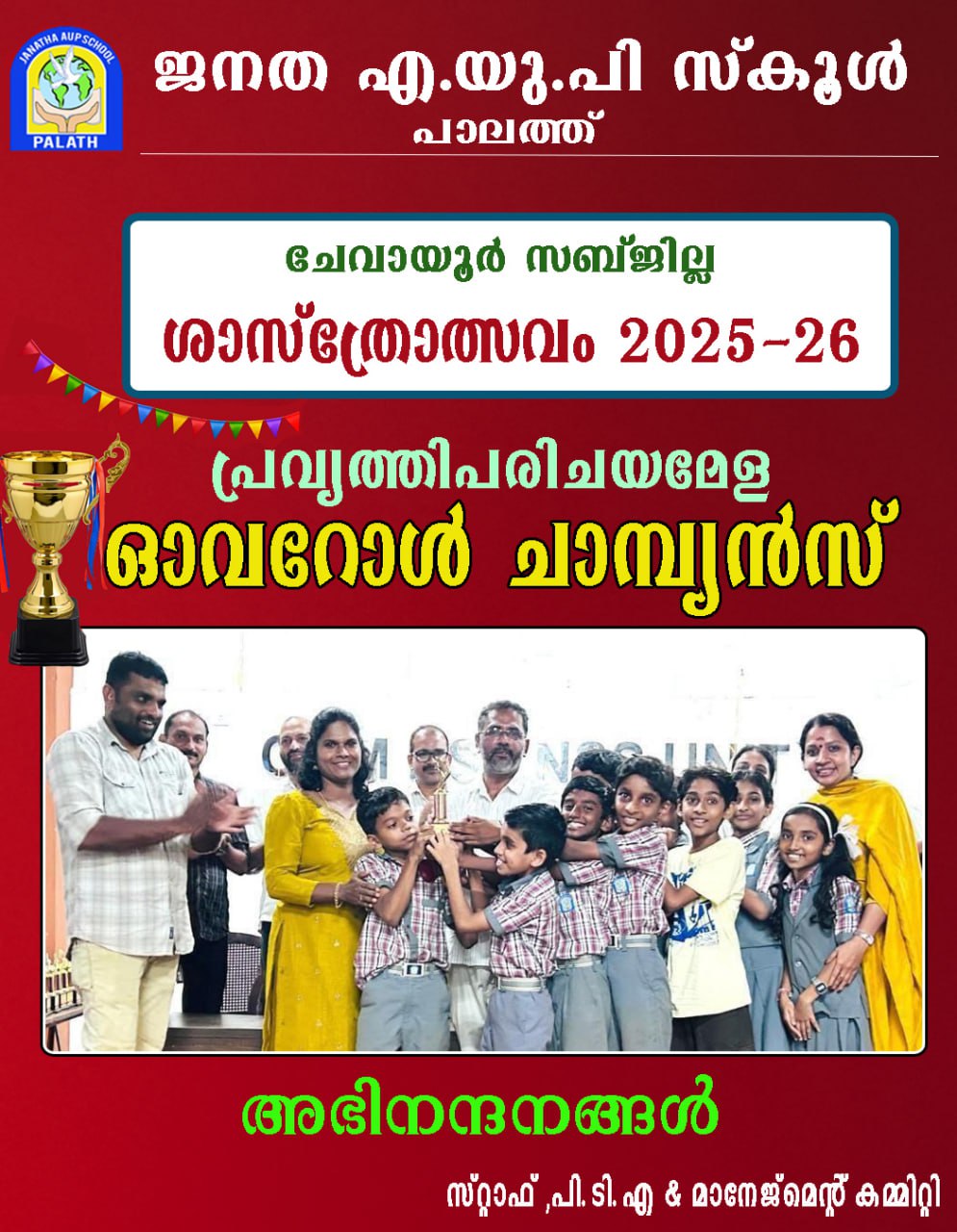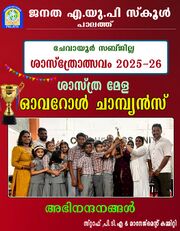 | 19:13, 23 നവംബർ 2025 | 17471-school-kalolsavam2.jpg (പ്രമാണം) | 177 കെ.ബി. | Janatha A U P School achieved an outstanding milestone by securing the overall championship in both Sanskrit and Arabic at the Chevayur Sub District School Arts Fest 2025–2026. This remarkable accomplishment reflects the students’ deep dedication, linguistic talent, and cultural appreciation. Guided by committed teachers, the participants delivered exceptional performances in various language-based events. The dual overall victory highlights the school’s strong academic and artistic foundatio... | അതെ | |