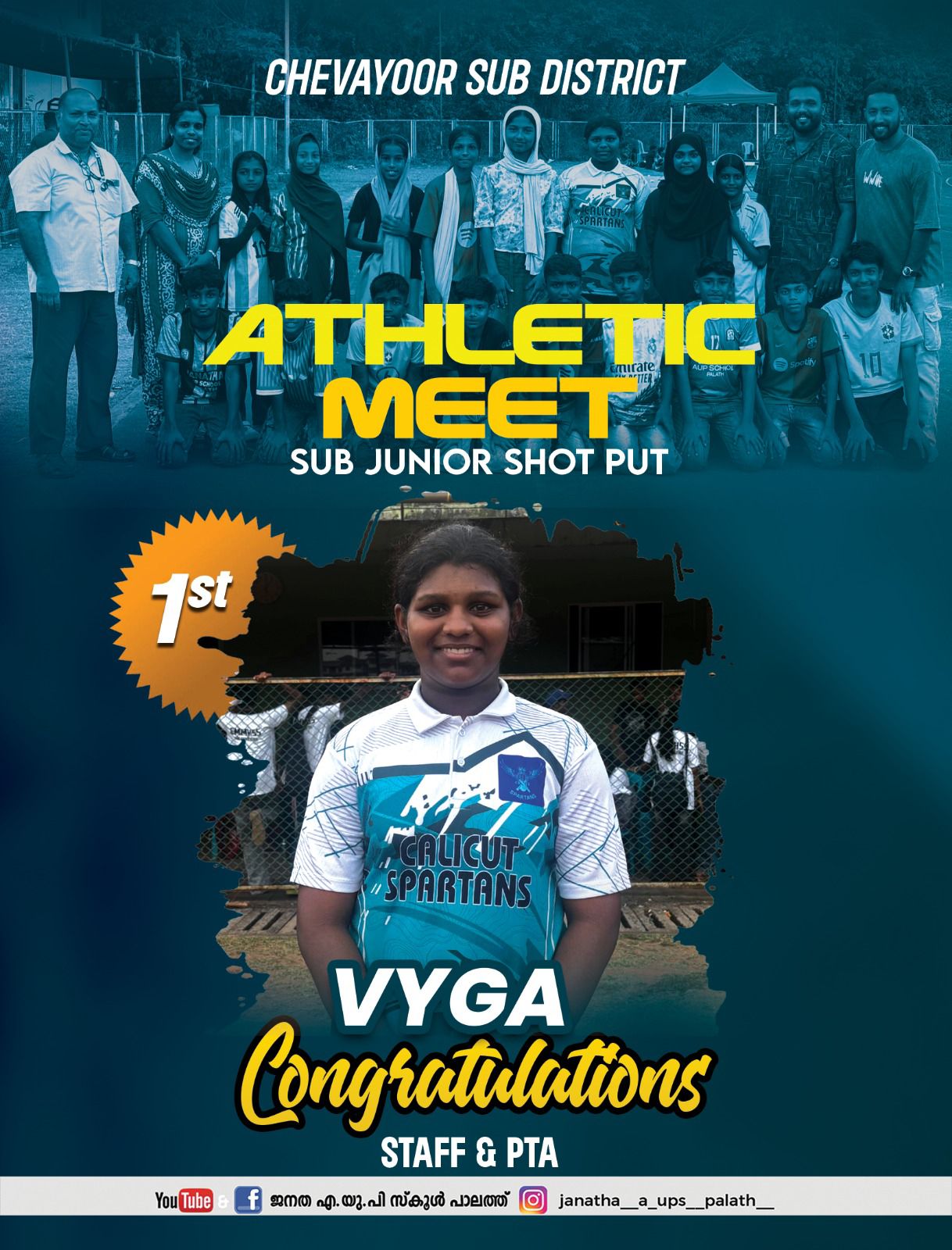 | 18:59, 23 നവംബർ 2025 | 17471-school-sports2.jpg (പ്രമാണം) | 277 കെ.ബി. | Janatha A U P School celebrates the outstanding achievement of Vyga from Grade 7, who claimed first place in the Sub-Junior Shot Put event at the Chevayur Athletic Meet. With impressive power and skill, Vyga delivered a winning throw that showcased her commitment and athletic talent. Her victory stands as a proud moment for the school and a shining example of what dedication can accomplish. Heartfelt congratulations to Vyga for her remarkable performance! വർഗ്ഗം:17471 | അതെ | |