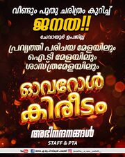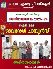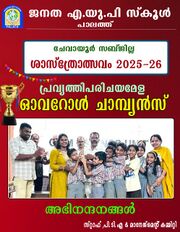 | 11:09, 27 നവംബർ 2025 | 17471-school-shasthramela.jpg (പ്രമാണം) | 221 കെ.ബി. | Janatha A U P School proudly secured the overall first prize in the Shasthrolsavam at the Chevayur Sub District Kalolsavam. This outstanding achievement showcases the scientific creativity and enthusiasm of the students. Headmistress Louly Teacher and Mirshad Sir received the trophy from the authorities during the award ceremony. Their guidance and support were instrumental in this success, bringing immense pride to the school community and highlighting the institution’s strong commitment to... | അതെ | |