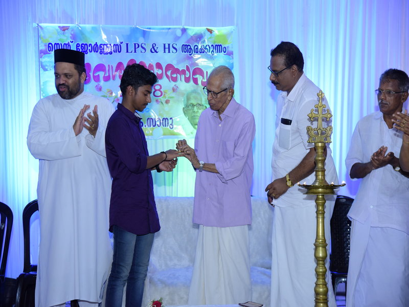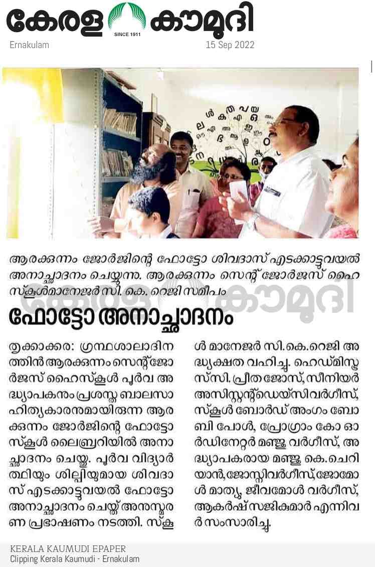 | 20:14, 21 നവംബർ 2022 | പാഠ്യേതര പ്രവർത്തനം പത്മശ്രീ മട്ടന്നൂർ ഭദ്രദീപം കൊളുത്തി ആരംഭിച്ചു.jpeg (പ്രമാണം) | 208 കെ.ബി. | ആരക്കുന്നം സെന്റ് ജോർജ്ജസ്സിൽ പാഠ്യേതര പ്രവർത്തനം പത്മശ്രീ മട്ടന്നൂർ ഭദ്രദീപം കൊളുത്തി ആരംഭിച്ചു. * മുളന്തുരുത്തി: 120 വർഷമായി പാഠ്യപാഠ്യേതര രംഗത്ത് മാതൃകപരമായി പ്രവർത്തിച്ചു വരുന്ന ആരക്കുന്നം സെന്റ് ജോർജ്ജസ് ഹൈസ്കൂളിൽ 2022-23 അദ്ധ്യയന വർഷത്തെ പാഠ്യേതര പ്രവർത്തനം വാദ്യകലയിലെ കുലപതി മലയാളത്തിന്റെ വാദ്യ സൗഭാഗ്യം പത്മശ്രീ മട്ടന്നൂർ ശങ്കരൻ കുട്ടി മാരാർ ഭദ്രദീപം കൊളുത്തി ഉദ്ഘാടനം നിർവ്വഹിച്ചു. സ്കൂൾ മാനേജർ സി.കെ റെജി അദ്ധ്യക്ഷത വഹിച്ചു. സംഗീത സംവിധായകൻ വിജയ് പി ജേക്കബ് മുഖ്യാതിഥിയായി പങ്കെടുത്തു.... | 1 | |
