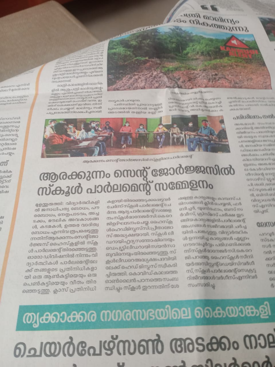 | 20:18, 21 നവംബർ 2022 | ഒരു ഭൂമി മാത്രം പദ്ധതി ആരംഭിച്ചു.jpg (പ്രമാണം) | 161 കെ.ബി. | ആരക്കുന്നം സെന്റ് ജോർജ്ജസിൽ ഒരു ഭൂമി മാത്രം പദ്ധതി ആരംഭിച്ചു. മുളന്തുരുത്തി : ഈ പരിസ്ഥിതി ദിനത്തിന്റെ ആമുഖവാക്യം പ്രാവർത്തികമാക്കിക്കൊണ്ട് ആരക്കുന്നം സെന്റ് ജോർജ്ജസ് ഹൈസ്കൂൾ കാമ്പസിൽ ഒരു ഭൂമി മാത്രം പദ്ധതി ആരംഭിച്ചു. സ്കൂൾ കാമ്പസിൽ ചന്ദന മരത്തിന്റെ തൈ നട്ടു കൊണ്ട് ഹൈസ്കൂൾ ഹെഡ് മിസ്ട്രസ് പ്രീത ജോസ് സി ഉദ്ഘാടനം നിർച്ചഹിച്ചു. തുടർന്ന് മറ്റുള്ളവർ കാമ്പസിൽ ഫലവൃക്ഷ തൈകൾ നട്ടു. ചടങ്ങിൽ സ്കൂൾ മാനേജർ സി.കെ റെജി, ഹൈസ്കൂൾ പി.ടി.എ പ്രസിഡന്റ് ബീന പി നായർ , ഹൈസ്കൂൾ സീനിയർ അസിസ്റ്റന്റ് ഡെയ്സി വർഗീസ്, പ്രോഗ്... | 1 | |