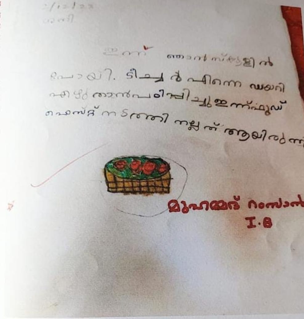 | 12:37, 6 മാർച്ച് 2024 | 41221-KLM-KUNJ-2.jpeg (പ്രമാണം) | 68 കെ.ബി. | kunjezhuthukal of class 1 student വർഗ്ഗം:ഒന്നാം ക്ലാസ്സുകാരുടെ രചനകൾ | 1 | |