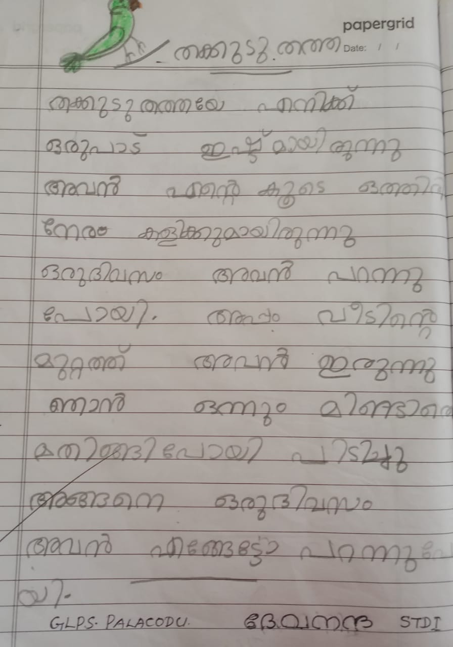 | 18:34, 7 മാർച്ച് 2024 | 39302-KLM-KUNJ-Sivani S sarath.jpeg (പ്രമാണം) | 66 കെ.ബി. | kunjezhuth of class 1 student വർഗ്ഗം:ഒന്നാം ക്ലാസ്സുകാരുടെ രചനകൾ | 1 | |