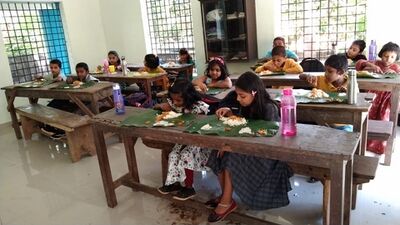 ഉച്ചഭക്ഷണം അദ്യാപകർക്കൊപ്പം വിളമ്പുന്ന പ്രധാനാധ്യാപിക