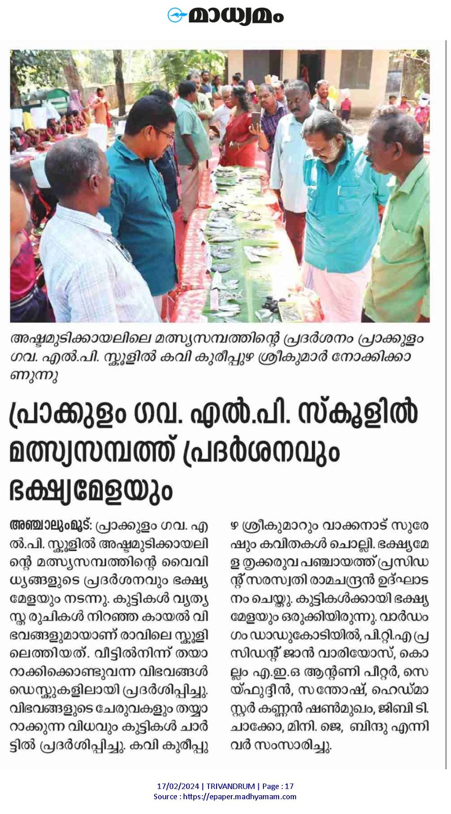 പ്രാക്കുളം ഗവ എൽ.പി. സ്കൂളിൽ നടന്ന കായൽപ്പെരുമ – കായലിൽ നിന്നൊരു പങ്ക് എന്ന പരിപാടിയെക്കുറിച്ച് മാധ്യമം കൊല്ലം എഡീഷനിൽ പ്രസിദ്ധീകരിച്ച വാർത്ത