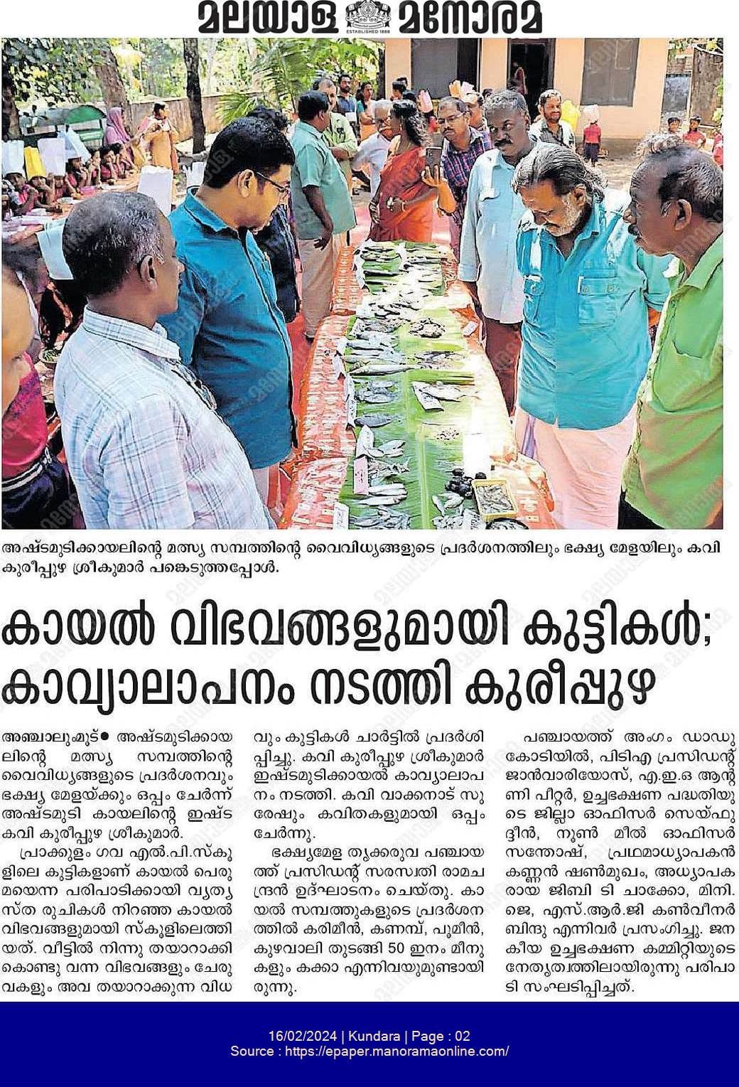 പ്രാക്കുളം ഗവ എൽ.പി. സ്കൂളിൽ നടന്ന കായൽപ്പെരുമ – കായലിൽ നിന്നൊരു പങ്ക് എന്ന പരിപാടിയെക്കുറിച്ച് മലയാള മനോരമ കൊല്ലം എഡീഷനിൽ പ്രസിദ്ധീകരിച്ച വാർത്ത