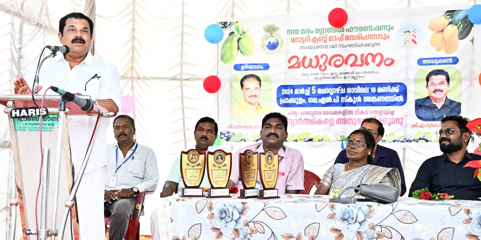 123 വർഷം പാരമ്പര്യം പേറുന്ന പ്രാക്കുളം ഗവൺമെന്റ് എൽപി സ്കൂളിൽ പരിസ്ഥിതി സംരക്ഷണത്തിന്റെ ഭാഗമായി വിദ്യാർത്ഥികൾക്കും പൊതുസമൂഹ ത്തിനും കൊടുക്കുന്ന ബോധവൽക്കരണത്തിന് വേണ്ടി നന്മമരം ഗ്ലോബൽ ഫൗണ്ടേഷനും റോട്ടറി ക്ലബി ഓഫ് ദേശിംഗനാട് കൊല്ലവും സംയുക്തമായി സംഘടിപ്പിച്ച വൃക്ഷ വ്യാപന പദ്ധതിയായ മധുരവനം സ്കുൾ അങ്കണത്തിൽ ശ്രീ.മുകേഷ് എം.എൽ.എ ഫലവൃക്ഷ തൈ നട്ടുകൊണ്ട് ഉദ്ഘാടനം നിർവഹിച്ചു.