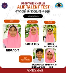 ഭാഷയിലെ മികവ് പ്രകടിപ്പിക്കാൻ വിദ്യാർത്ഥികൾക്ക് അവസരമൊരുക്കി കൊണ്ട് സംസ്ഥാന തലത്തിൽ നടത്തുന്ന അലിഫ് ടാലൻ്റ് ടെസ്റ്റിൻ്റെ സ്കൂൾ തല മത്സരം പി പി ടി എം വൈ എച്ച് എസ് എസ് അറബിക് ക്ലബിനു കീഴിൽ സംഘടിപ്പിച്ചു. പരീക്ഷ കുട്ടികളുടെ പങ്കാളിത്തം കൊണ്ടും അധ്യാപകരുടെ കൃത്യമായ നടത്തിപ്പ് രീതി കൊണ്ടും ശ്രദ്ധേയമായിരുന്നു. 150 തിലധികം വിദ്യാർത്ഥികൾ പങ്കെടുത്ത ടാലൻ്റ് ടെസ്റ്റ് രണ്ട് റൗണ്ടുകളിലായാണ് നടന്നത്. 10 T ക്ലാസ്സിൽ പഠിക്കുന്ന നിദ ഇ ഒന്നാം സ്ഥാനം നേടി. റൻഹ (10:S), കൻസ ഫാത്തിമ (10:S) യഥാക്രമം രണ്ടും മൂന്നും സ്ഥാനങ്ങൾ നേടി. മുഹമ്മദ് ബിൻഷാൻ (10:B), മലൂഫ (8:Q) ബെസ്റ്റ് പെർഫോർമേഴ്സായി തിരഞ്ഞെടുത്തു. ഹെഡ്മാസ്റ്റർ KP അബ്ദുൾ അസീസ് സർ ടാലൻ്റ് എക്സാം ഉദ്ഘാടനം ചെയ്തൂ. അയ്യൂബ് മാസ്റ്റർ, മൊയ്തീൻ മാസ്റ്റർ, ഫൈസൽ മാസ്റ്റർ, നൗഫൽ, സാജിദ, മുബഷിർ, അബ്ദുൽ വാരിസ്, നാസർ എന്നിവർ നേതൃത്വം നൽകി.