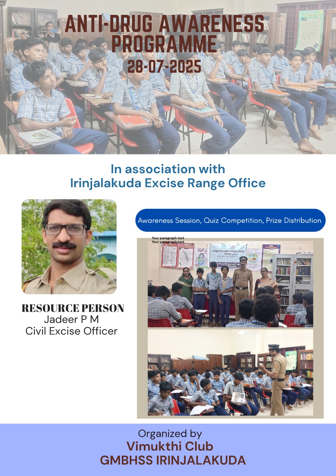 സ്കൂൾ വിമുക്തി ക്ലബ്ബിന്റെ നേതൃത്വത്തിൽ ഹൈസ്കൂൾ വിദ്യാർത്ഥികൾക്ക് ഇരിഞ്ഞാലക്കുട എക്സൈസ് റേഞ്ച് ഓഫീസ്, ലഹരിവിരുദ്ധ ബോധവൽക്കരണ ക്ലാസ്സ് നൽകി