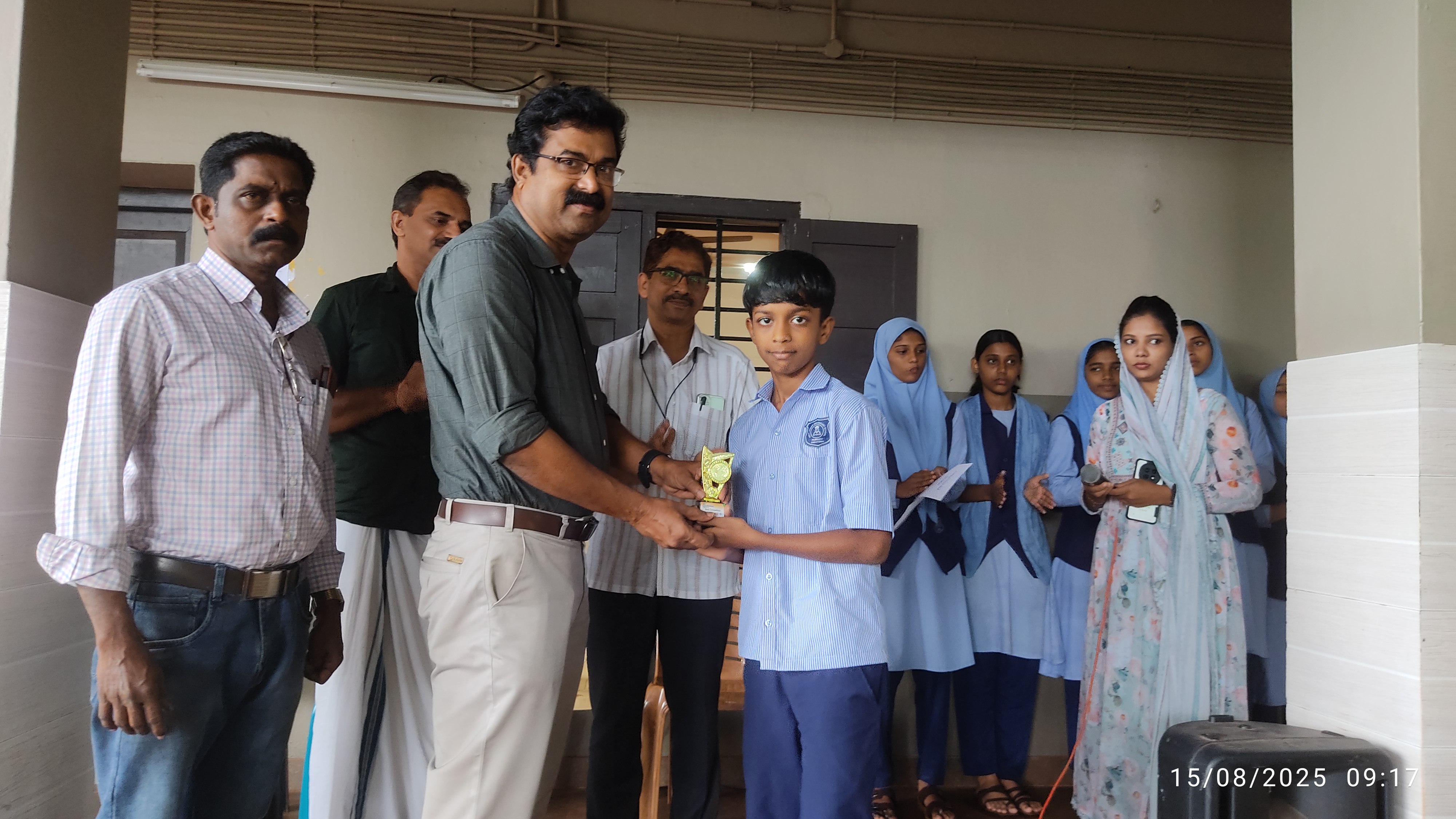 2025 ആഗസ്ത് 15, സ്വാതന്ത്ര്യദിന ക്വിസ്സ് മത്സര വിജയിക്ക് പ്രിൻസിപ്പൾ സമ്മാനദാനം നിർവഹിക്കുന്നു.