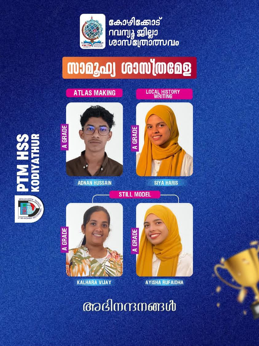 സാമൂഹ്യ ശാസ്ത്രമേളയിൽ ജില്ലയിൽ PTMHS കൊടിയത്തൂരിൻ്റെ തേരോട്ടം