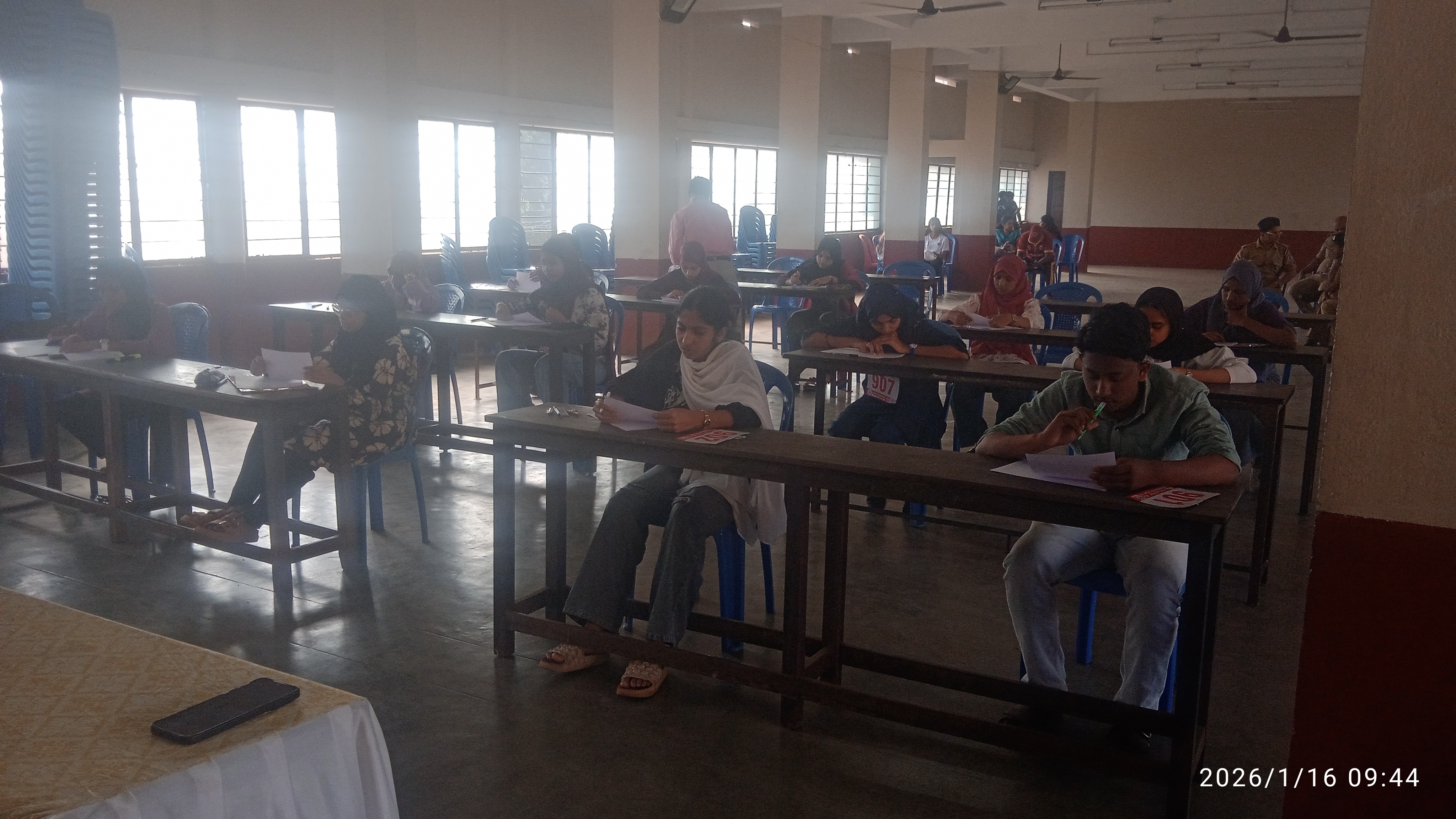 20:21, 16 ജനുവരി 2026-നു ഉണ്ടായിരുന്ന രൂപം സൃഷ്ടിച്ചത്:- 9446078880 (സംവാദം | സംഭാവനകൾ) (A High School classroom at CMS HSS Thrissur serves as the venue for the Arabic Upanyasam (Essay Writing) competition during the 64th Kerala School Kalolsavam 2026. The photograph, taken at 09:44 AM on January 16, 2026, shows a group of students (including Chest No. 907) deeply focused on their writing tasks. The setting illustrates the quieter, academic side of the festival, where students demonstrate their mastery of the Arabic language through creative and analytical writing. Photo clicked...)